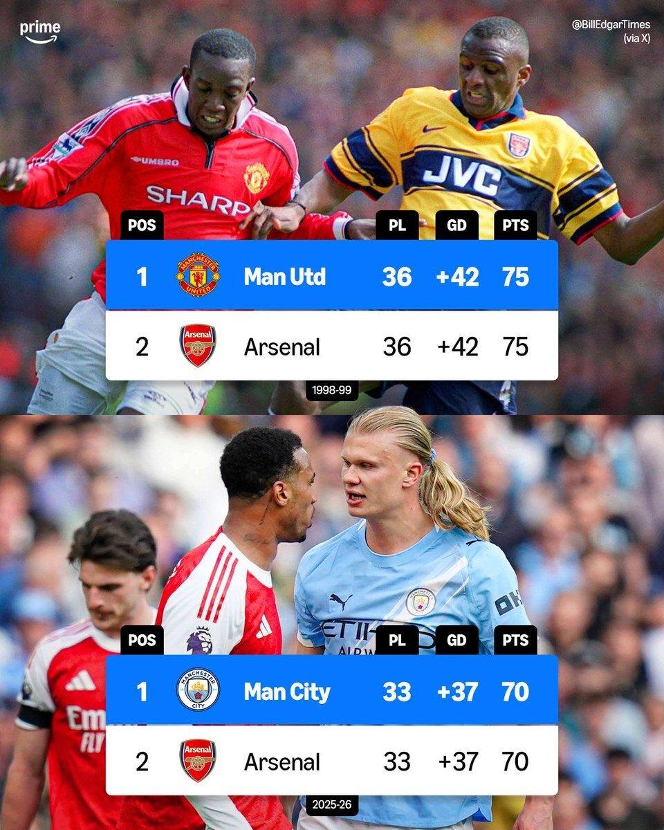 Это первый раз с 1999 года, когда две первые команды в Премьер-Лиге имеют одинаковое количество очков и одинаковую разницу мячей на момент 33-го тура или позже 🍿