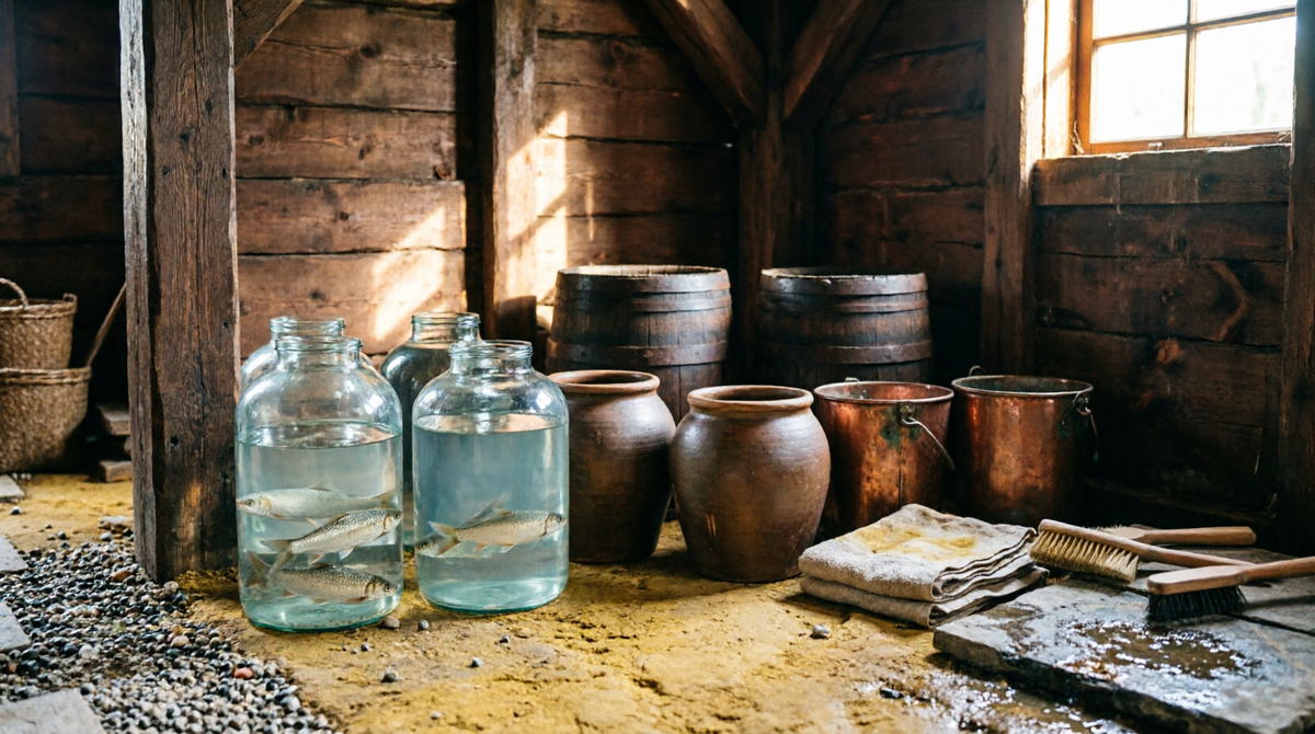 Как сохранить рыбу живой... без холодильника! 🐟 Американское изобретение 1890-х: рыба живет 3 недели в банке! Представьте: рыба плавает в закрытой банке целых три недели! В 1893 году это казалось чудом. Сегодня мы знаем — это просто наука. Но тогда это было революцией! Оригинал (1893 г.): «Въ Соединенныхъ Штатахъ нѣкто Марфи открылъ, что рыба можетъ быть сохраняема живою довольно продолжительное время, если сосудъ, въ которомъ она находится, только частью заполненъ водою и герметически закупоренъ. При опытѣ, по прошествіи 48 часовъ рыба въ открытой банкѣ умерла, тогда какъ въ закупоренной рыба оставалась живою даже спустя три недѣли.» Как готовили тогда: Американец по имени Марфи сделал удивительное открытие: если поместить рыбу в сосуд, заполненный водой лишь частично, и герметично закрыть — рыба живет неделями! В открытом сосуде рыба погибала уже через 48 часов, а в закупоренной банке плавала целых три недели! Секрет в том, что в закрытом пространстве с ограниченным количеством воды