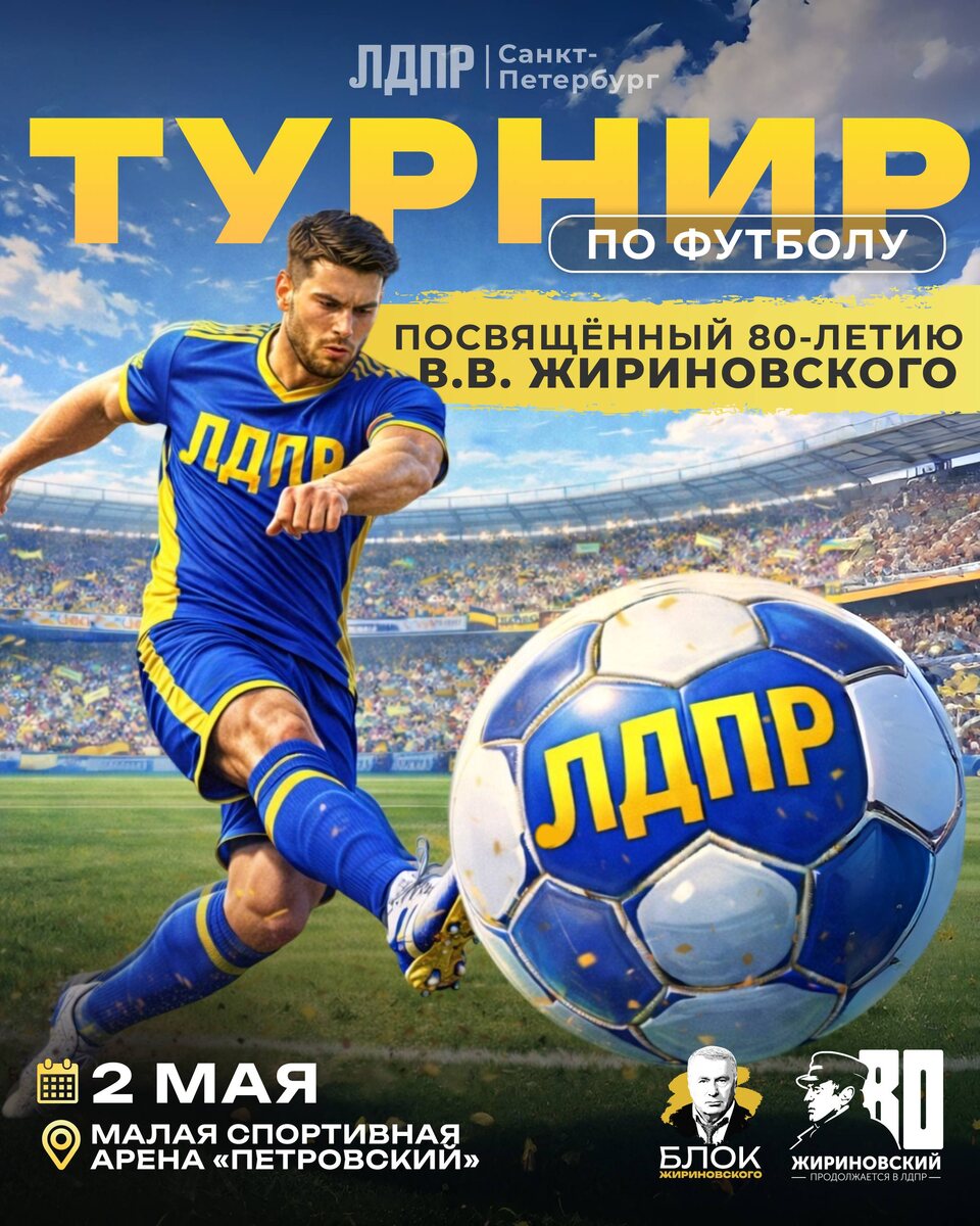 2 мая на Малой спортивной арене «Петровский» состоится футбольный турнир Санкт-Петербургского регионального отделения ЛДПР, приуроченный к 80-летию Владимира Вольфовича Жириновского. К участию приглашаются любительские (дворовые) команды - все, для кого футбол это часть активной и здоровой жизни. Формат турнира - 5×5. Турнир станет не только спортивным событием, но и возможностью: • провести время в атмосфере честной борьбы и командного духа • поддержать развитие массового спорта в городе • отдать дань памяти Основателю ЛДПР • укрепить здоровье и зарядиться энергией Сбор участников - с 11:00 Церемония открытия - в 12:00 Перед участием обязательно ознакомьтесь с положением турнира. По всем вопросам, а также для подачи заявок обращайтесь к Матвею Повякало: @Mldprr Ждём команды и болельщиков - будет по-настоящему ярко и по-спортивному! 🔗 Мы ВКонтакте 🔢 Мы в МАХе 🖥 Сайт ЛДПР | Санкт-Петербург