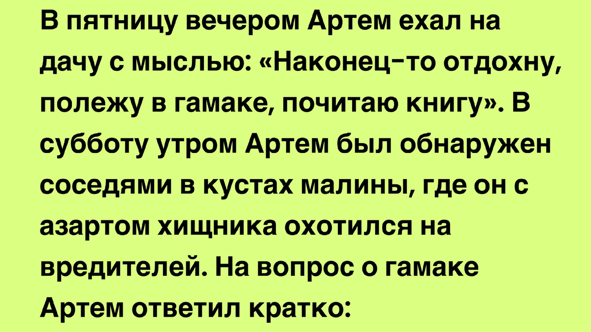 Друзья, дачный сезон — это не только тяжелый труд, но и время невероятных историй, нелепых ситуаций и самого искреннего смеха. Пусть ваши грядки будут ровными, соседи — адекватными, а урожай — таким, чтобы его не стыдно было выложить в соцсети без фильтров. Помните, что главный результат поездки на дачу — это не количество банок с огурцами, а заряд бодрости (и немного боли в пояснице) на всю рабочую неделю.