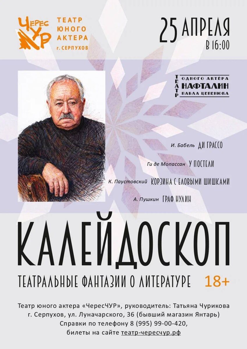 ✨ Премьера! "КАЛЕЙДОСКОП"🎭театральные фантазии о литературе Нафталин — это то, что помогает спасти драгоценную вещь от тлена. А театр должен спасать шедевры классики📚 Именно так считает основатель театра одного актёра "Нафталин" режиссер и актёр Павел Аркадьевич Цепенюк. Не пропустите ПРЕМЬЕРУ и рождение нового Театра! 🚫 Возраст: 18+ 📆 25.04.2026 🕒 16:00 🏢 Театр Юного Актёра "ЧересЧУР" 📍 г. Серпухов, ул. Луначарского, д.36 💰 Цена от: 1000 до 1300 ₽ 🎫 Купить билет: 👉КУПИТЬ БИЛЕТ👈 - https://quicktickets.ru/serpuhov-teatr-chereschur #спектакльСерпухов #концертСерпухов #театрСерпухов #ЧересчурСерпухов ⭐Поддержать канал голосом 💰 Канал Вакансии Серпухова ✅ Мероприятия Серпухов https://dzen.ru/id/66f01c6eb4c6fe60c9ca1608 https://vk.ru/serpukhov_events http://dzen.ru/serpukhov_events