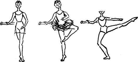 - Раскрытие рабочей ноги в воздух (на высоту 45° или 90°) с одновременным опусканием опорной ноги на demi-plié.