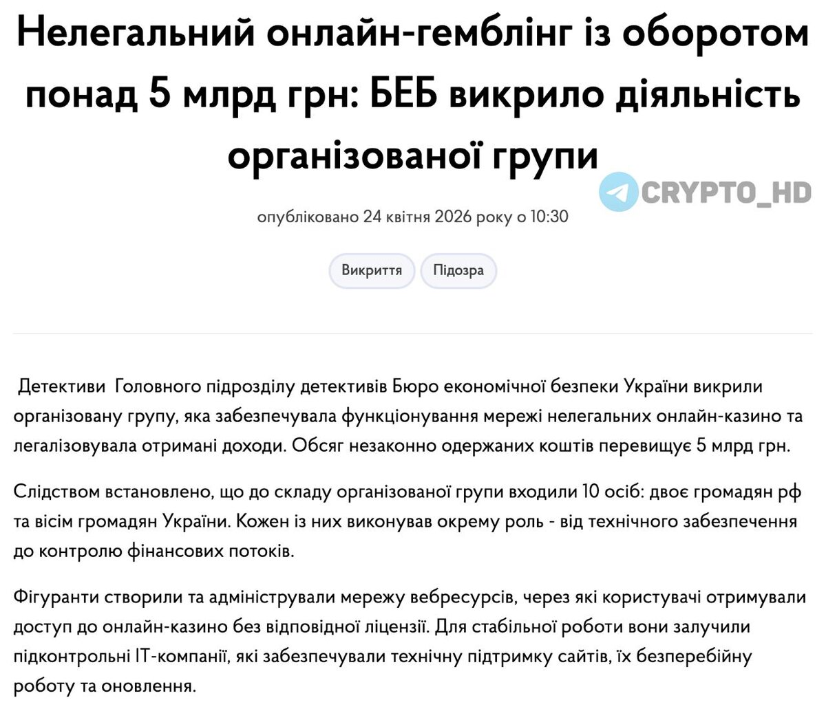 Речь о сети нелегальных онлайн-казино – пользователи платили в криптовалюте, после чего средства распределялись по офшорам. Далее активы «очищались» и маскировались под легальные доходы. В схеме участвовали 10 человек – граждане Украины и РФ. Им уже предъявлены подозрения за нелегальный игорный бизнес и отмывание средств. Crypto Headlines