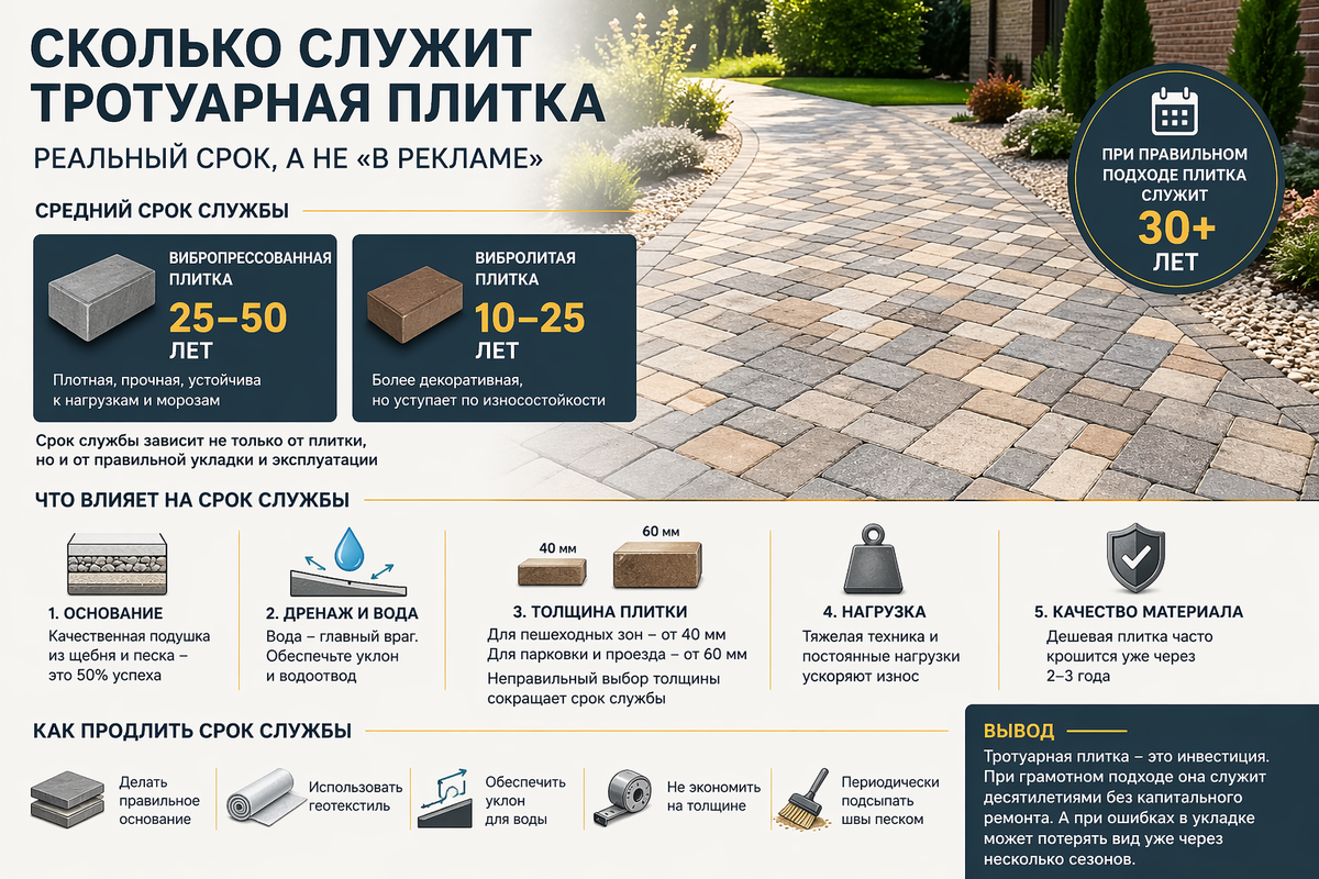 Тротуарная плитка — это не временное решение на пару сезонов. При правильном выборе и укладке она спокойно служит десятилетиями. Но есть нюансы, которые напрямую влияют на срок службы.