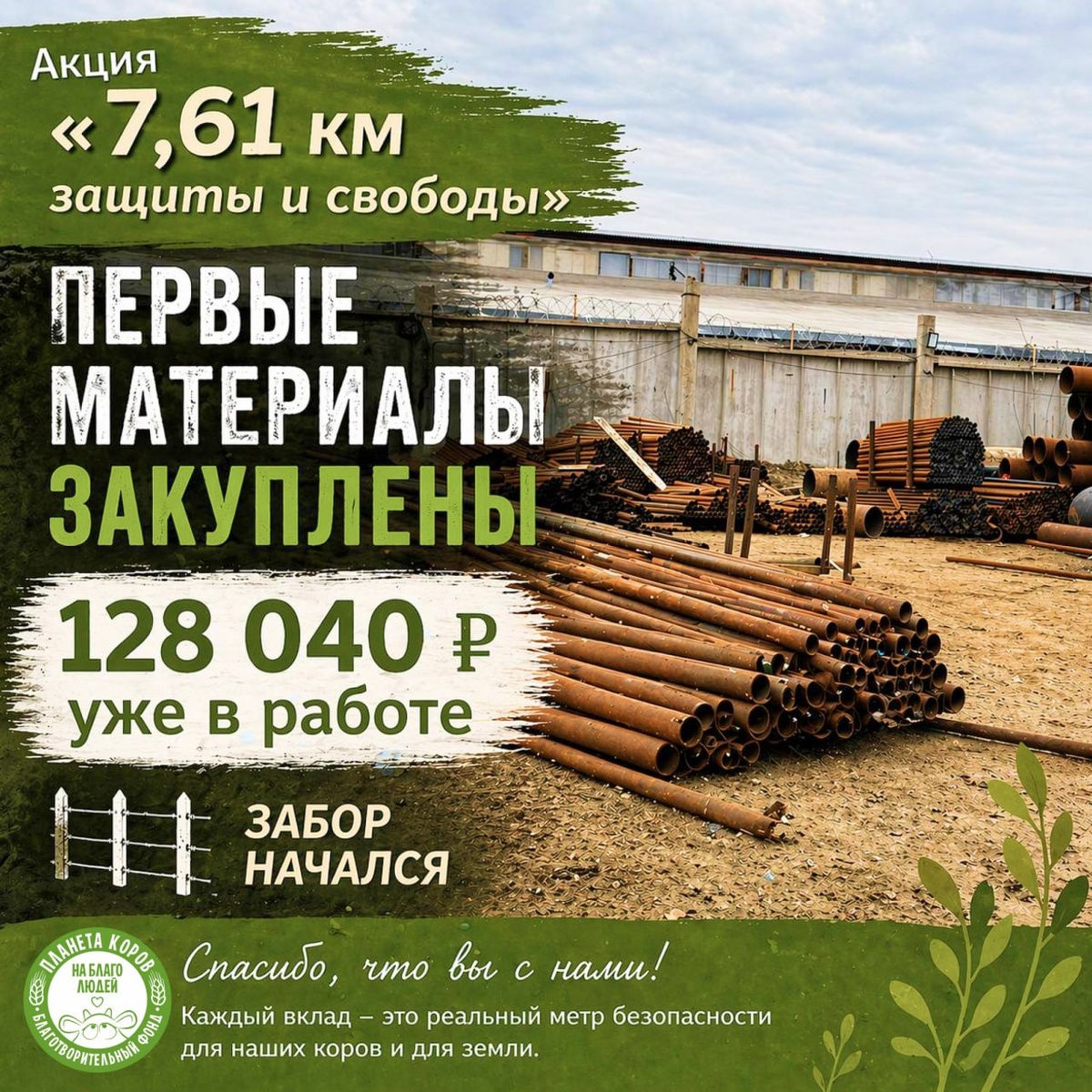 ! 🙌 💝 Друзья, новости по-настоящему вдохновляют! Благодаря общей поддержке собрано уже 506 626 ₽. В переводе на язык защиты и свободы — это 1,96 км надёжного ограждения. Это значит, что почти четверть пути пройдена! Проект окончательно перестал быть просто планом на бумаге. Монтаж начинается, и день, когда стадо выйдет на просторные пастбища, становится всё ближе с каждым часом. Что это значит прямо сейчас? 👉 Забор становится реальностью. 👉 Подготовка к монтажу в самом разгаре. 👉 Коровушки уже чувствуют весну и ждут выхода на большую траву. Впереди еще 5,65 км. ❗️Именно сейчас — самый ответственный и важный момент, ведь от темпа сбора зависит, как быстро закроется этот контур безопасности. 120 подопечных ждут возможности гулять свободно, а 140 гектаров земли готовы принять их и начать свое восстановление. 💞 Спасибо каждому сердцу, которое уже откликнулось. Ваше участие превращает обычные метры в территорию свободы, а цифры в отчётах — в реальную заботу о жизни. 🐄 Идем дал