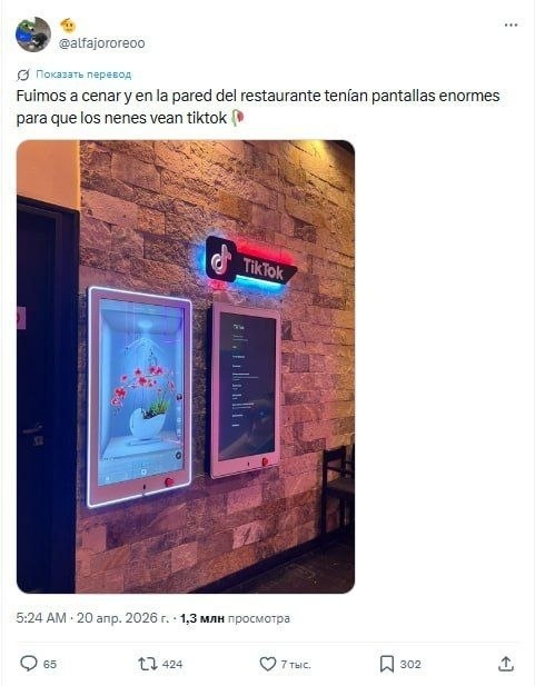 Это конец: испанец обнаружил в ресторане на стене огромные экраны, на которых детишки могут смотреть TikTok.