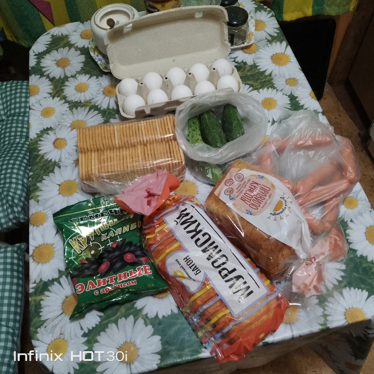 Яйца, огурцы, печенье, хлеб, семечки и сосиски. 🌭