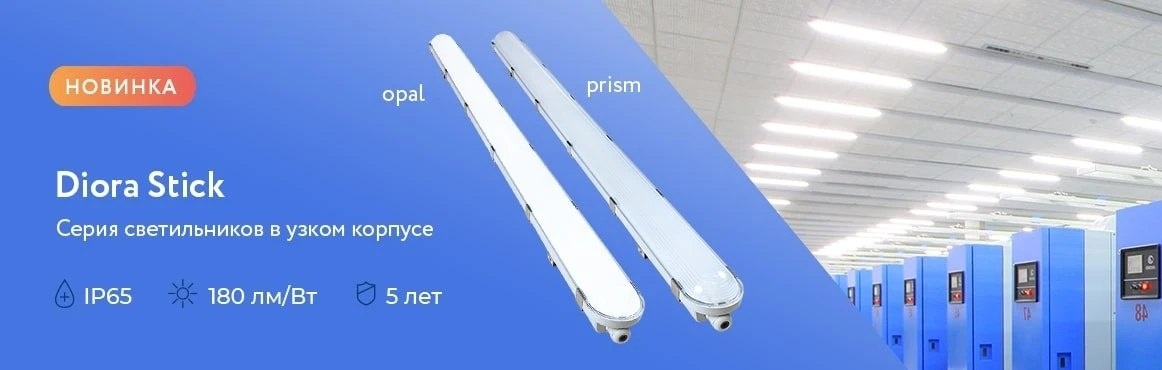 Основные преимущества новинки Высокая энергоэффективность: при мощности всего 23 Вт светильник обеспечивает световой поток 3500 лм (световая отдача 152 лм/Вт), что гарантирует значительную экономию электроэнергии. Долговечность и гарантия: срок службы до 100 000 часов и гарантия 5 лет — это уверенность в бесперебойной работе на долгие годы. Надёжная защита: степень защиты IP65 позволяет использовать светильник в помещениях с повышенной влажностью и запылённостью. Комфортный свет: опаловый рассеиватель и цветовая температура 3000 К (тёплый белый) создают мягкое, равномерное освещение без слепящего эффекта, а минимальная пульсация (<1%) снижает утомляемость глаз. Простота монтажа: металлический крепёж входит в комплект, что обеспечивает быструю и надёжную установку. Области применения Промышленные цеха и производственные помещения. Офисы, коридоры, подсобные помещения. Склады, логистические центры. Объекты с высокими требованиями к качеству и надёжности освещения. Diora Stick 23/3500 opa