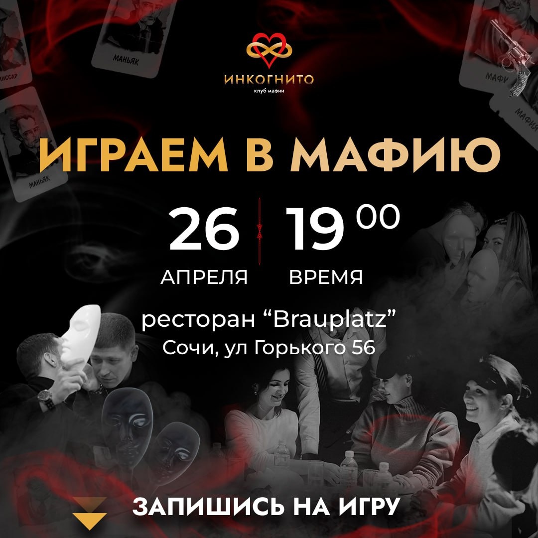 🖤 Хочешь провести вечер не в телефоне, а в живой игре, где всё решают твои слова? Мафия — это не просто игра. Это эмоции, люди и неожиданные повороты, после которых обсуждают ещё неделю. 📆 Воскресенье, 26 апреля ⏰ 19:00 — сбор новичков (объясним правила) 🎲 19:30–23:00 — игра 📍Сочи, ул. Горького 56, ресторан “Brauplatz” 💸 1000₽, вместо 1500₽ ⚠️ Мест немного — обычно разбирают заранее Почему приходят даже те, кто “не любит игры”: — знакомишься с новыми интересными людьми без неловкости — прокачиваешь уверенность и умение чувствовать людей — проживаешь за вечер больше эмоций, чем за неделю Формат: • отдельный уютный зал • 3 насыщенных игровых раунда • подходит даже если ты ни разу не играл 🎭 Записаться 👉 @incognitoadmn Клуб интеллектуальных игр "Инкогнито" Сочи