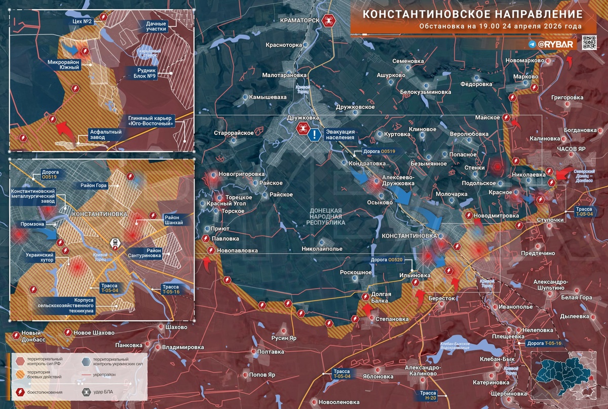 На Константиновском направлении продолжаются тяжелые боестолкновения вдоль всей линии фронта. Российские войска пытаются вклиниться в порядки ВСУ на флангах, что должно облегчить штурм одноименного города. 🔸На восточном фланге все еще фиксируется активность противника на окраинах Часова Яра. Российские артиллерийские расчеты наносят удары по позициям ВСУ в юго-восточной части города, фактически превращенного в руины за годы боев. В таких условиях закрепляться сложно обеим сторонам. В то же время без уверенного контроля ВС РФ над населенным пунктом будет крайне проблематично продвигаться на запад в сторону Николаевки и Красного, где также сохраняется присутствие ВСУ. 🔸На центральном участке направления Константиновки штурмовики предпринимают попытки закрепиться в Новодмитровке. На текущий момент в селе фиксируются позиции как ВС РФ, так и ВСУ. После закрепления бойцы смогут продвинуться в сторону Молочарки и простреливать позиции противника в центре Константиновки. 🔸В самом же городе