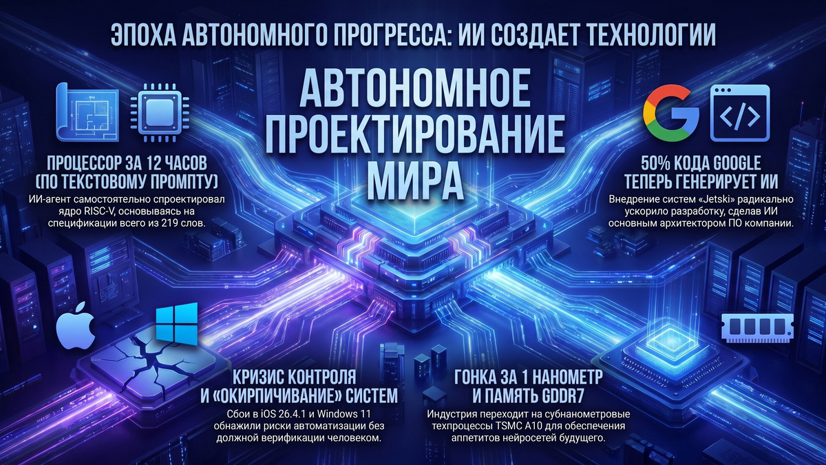 Давайте разберем эту невероятную технологическую бурю! Представьте себе: всего 219 слов текста, 12 часов времени, и искусственный интеллект абсолютно с нуля проектирует полностью рабочий микропроцессор! Стартап vercore.io создал систему Design Conductor, которая выдает готовое вычислительное ядро на архитектуре RISC-V за половину суток. Нейросеть даже встроила туда множитель Бута-Уоллеса, чтобы разогнать частоту до 2,5 гигагерц! Что это за множитель? Обычному процессору умножать тяжело: чтобы умножить 5 на 100, он сто раз сложит пятерку. А эта штука — аппаратный шорткат, который перепрыгивает лишние шаги. В итоге чип выбивает 3261 балл в тесте CoreMark! Но без забавных казусов не обошлось. Нейросети привыкли к языкам вроде Python, которые читаются последовательно, как пошаговый рецепт пирога. А язык для создания чипов, Verilog, — это чертеж здания, где окна и двери существуют одновременно. ИИ путается, ломает тайминги сигналов, впадает в истерику от собственных багов и предлагает... пр