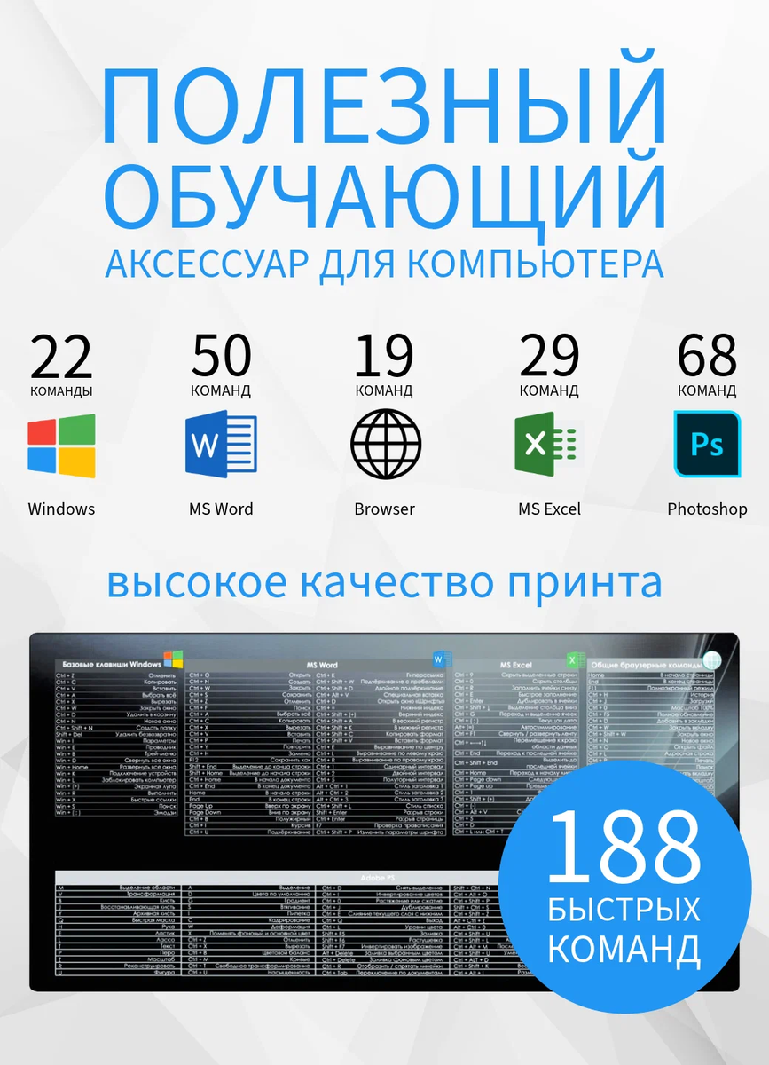 Замечали, как быстро захламляется рабочий стол? Мышь скользит по голому пластику, ноутбук лежит плашмя и греет колени, вечно не хватает портов USB, а кабели спутались в клубок. Я нашла на Я.Маркете 5 гаджетов, которые наводят порядок, ускоряют работу и радуют глаз. Все ссылки рабочие — ведущие прямо на Я.Маркет. ✅ Коврик для мыши и клавиатуры большой «Горячие клавиши»