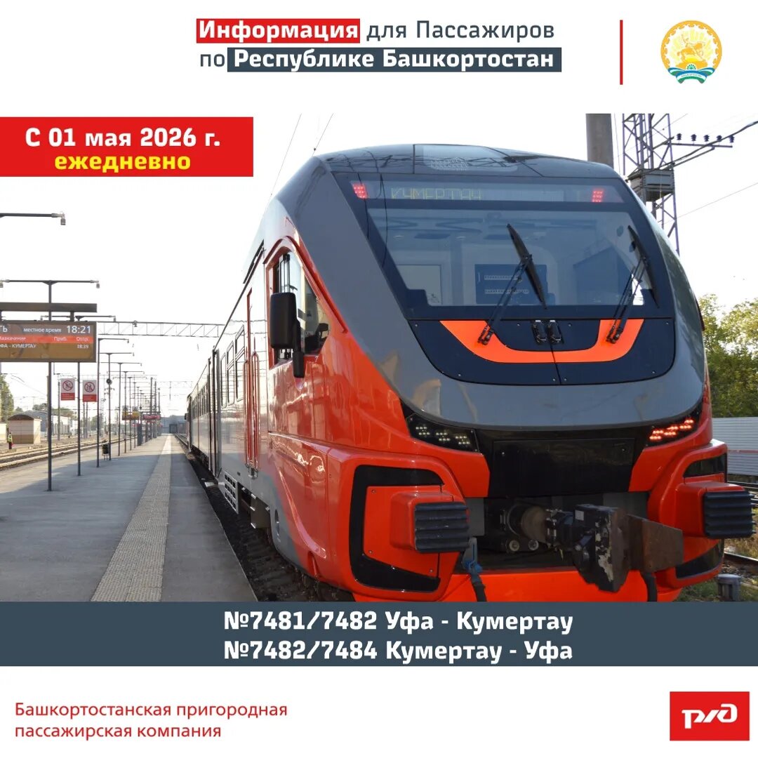 - №7483/7484 Кумертау (отпр. 5.28) – Уфа (приб. 8.36) Время указано местное. Остановки предусмотрены на станциях: Правая Белая, Дема, Уршак, Карламан, Белое Озеро, Стерлитамак, Салават, Мелеуз.