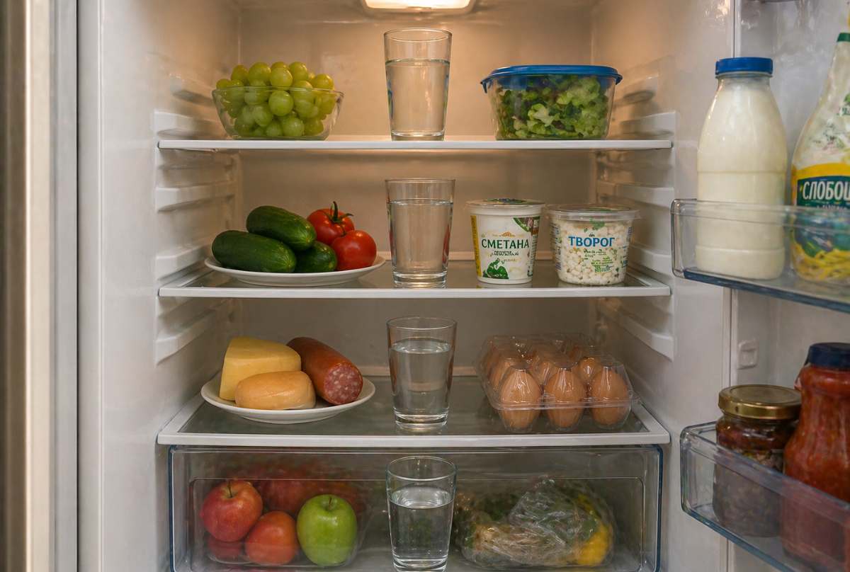 Если вы когда-нибудь заглядывали в холодильник к очень запасливым и экономным хозяйкам, то могли заметить странную деталь: на каждой полке стоит обычный стакан с водой. Зачем? Это не способ охладить воду для питья и не какая-то кулинарная уловка. У этого метода есть вполне научное, физическое обоснование, которое помогает продлить жизнь продуктам и сэкономить ресурсы холодильника. Скептики скажут: «Зачем загромождать и без того ценное пространство в холодильнике лишней посудой?» Но у этого простого действия есть веские причины, которые многие практикуют годами. Все дело в физике, а точнее — в понятии «тепловая инерция». Когда мы открываем дверцу холодильника, чтобы достать продукты, происходит неизбежное: холодный воздух «убегает», а внутрь попадает теплый кухонный воздух. Компрессору приходится включаться чаще и работать интенсивнее, чтобы вернуть температуру в норму. Эти постоянные температурные «качели» — главный враг свежести продуктов. Стаканы с водой в этом случае работают как