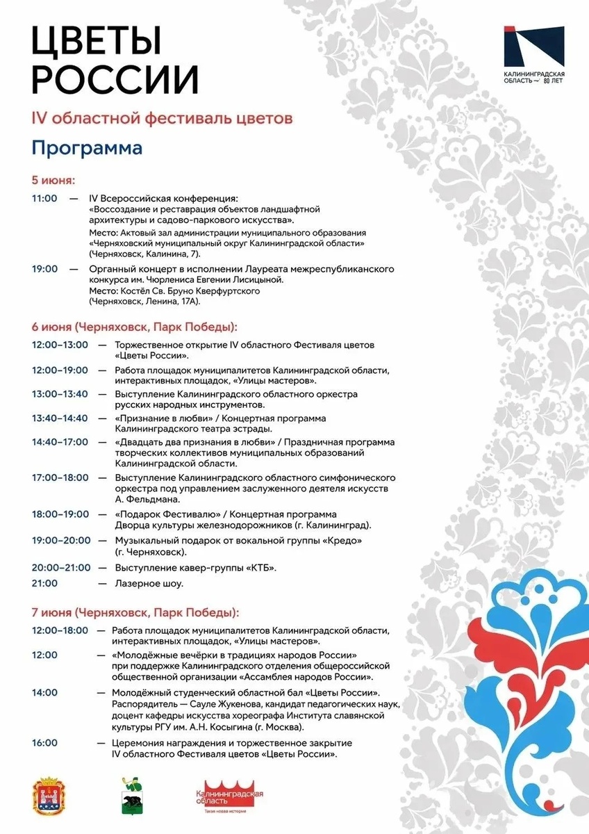 В рамках празднования 80-летия образования Калининградской области с 5 по 7 июня Черняховск вновь окунется в атмосферу цветочного великолепия. Четвертый ежегодный Фестиваль цветов обещает стать ярким событием, которое уже по праву вошло в число самых любимых и добрых традиций, ежегодно собирающих тысячи жителей и гостей округа. Об этом сообщил глава округа Виктор Вобликов на своей официальной странице в социальной сети.
