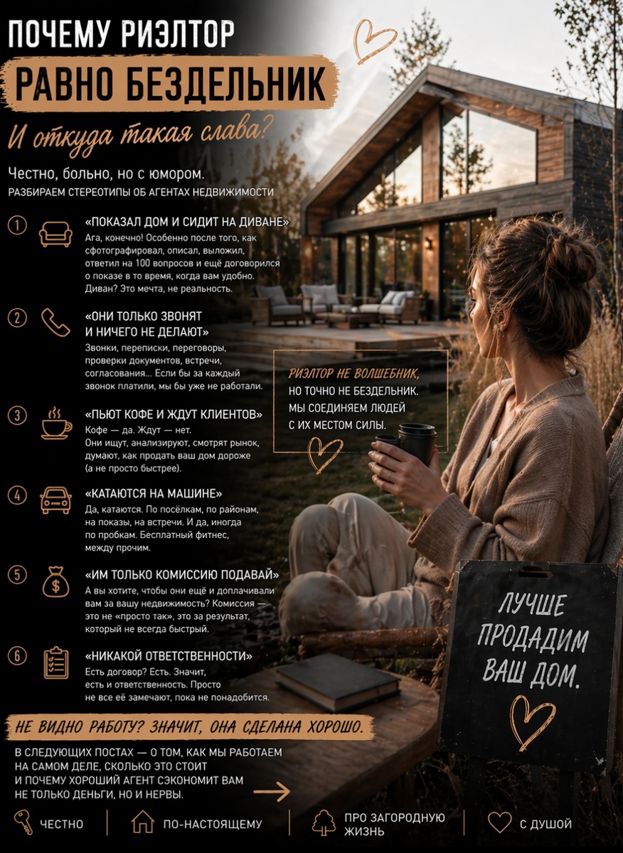 и получает комиссию. Ну серьёзно? За это деньги? А теперь — реальность. С юмором, но без прикрас 1. «Показал дом и сидит на диване»