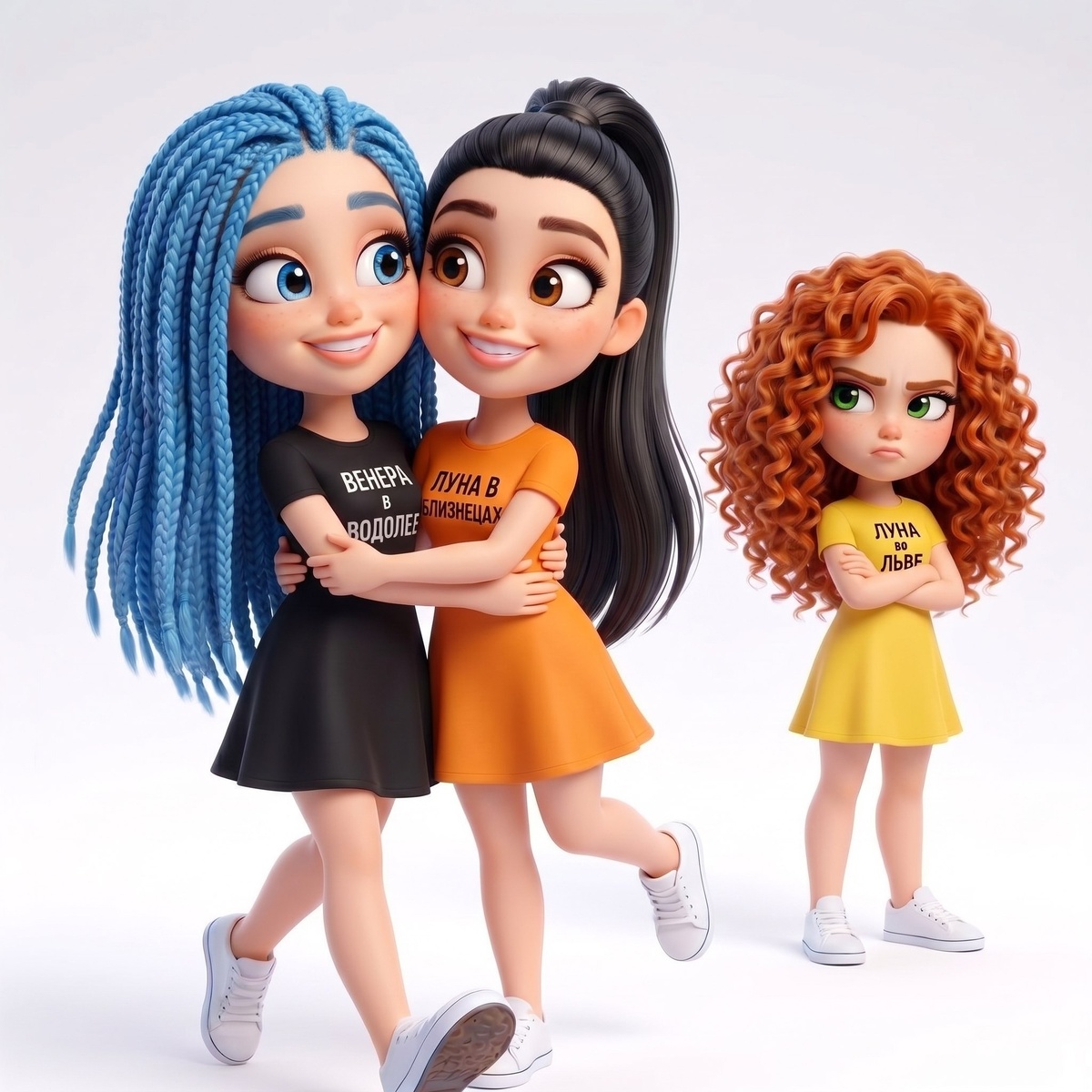 В моем мини мультике девушка сидит на работе, пока в космосе общаются ее планеты. Луна в Рыбах мечтает об идеальной любви на всю жизнь, любви, которой не существует в реальной жизни, а только в кино или соц. сетях (а это все иллюзия идеальности). Она уверена, что судьба сама ее найдет, надо просто сидеть и визуализировать. А Венера в Овне не любит мечтать, а любит действовать, увидела красивого парня, пошла и взяла его сама. Ее может тянуть на одноразовые связи, интрижки, романы, она не задумывается о будущем, живет в свое удовольствие здесь и сейчас. И такая Венера блокирует все мечты Луны, она на начальном этапе уже находит не подходящих для жизни партнеров и до серьезности может даже не доходить. В итоге мечтает об одном, а получает другое. Это самое сложное положение для отношений, которое необходимо увидеть у себя и осознано работать с этим.