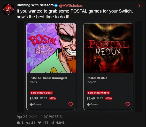 Студия Running With Scissors неожиданно устроила распродажу игр серии Postal в eShop
