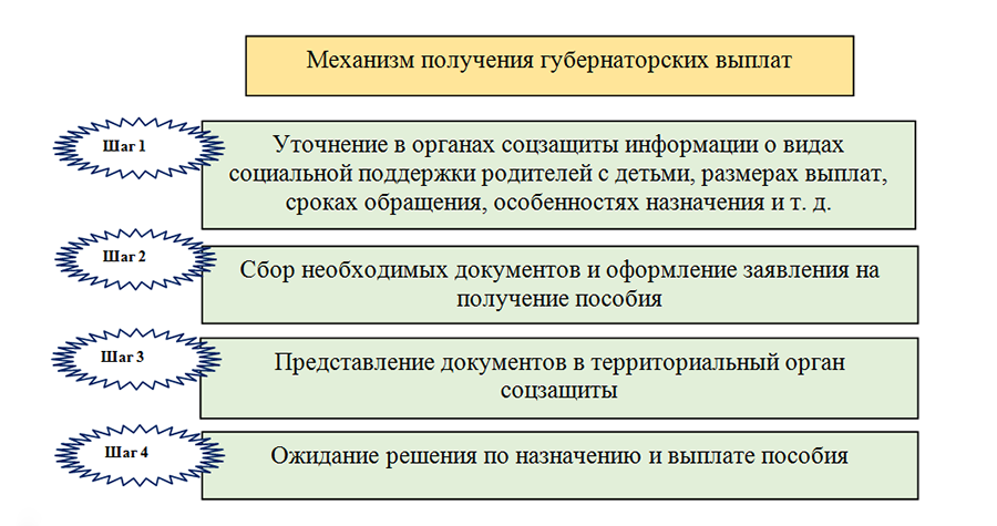 Для получения выплаты в органы соцзащиты необходимо представить заявление и подтверждающие документы (свидетельство о рождении ребенка, удостоверение личности получателя и др.). Конкретные размеры губернаторских выплат, порядок их получения и точный список необходимых документов уточняйте в органах соцзащиты по месту жительства.