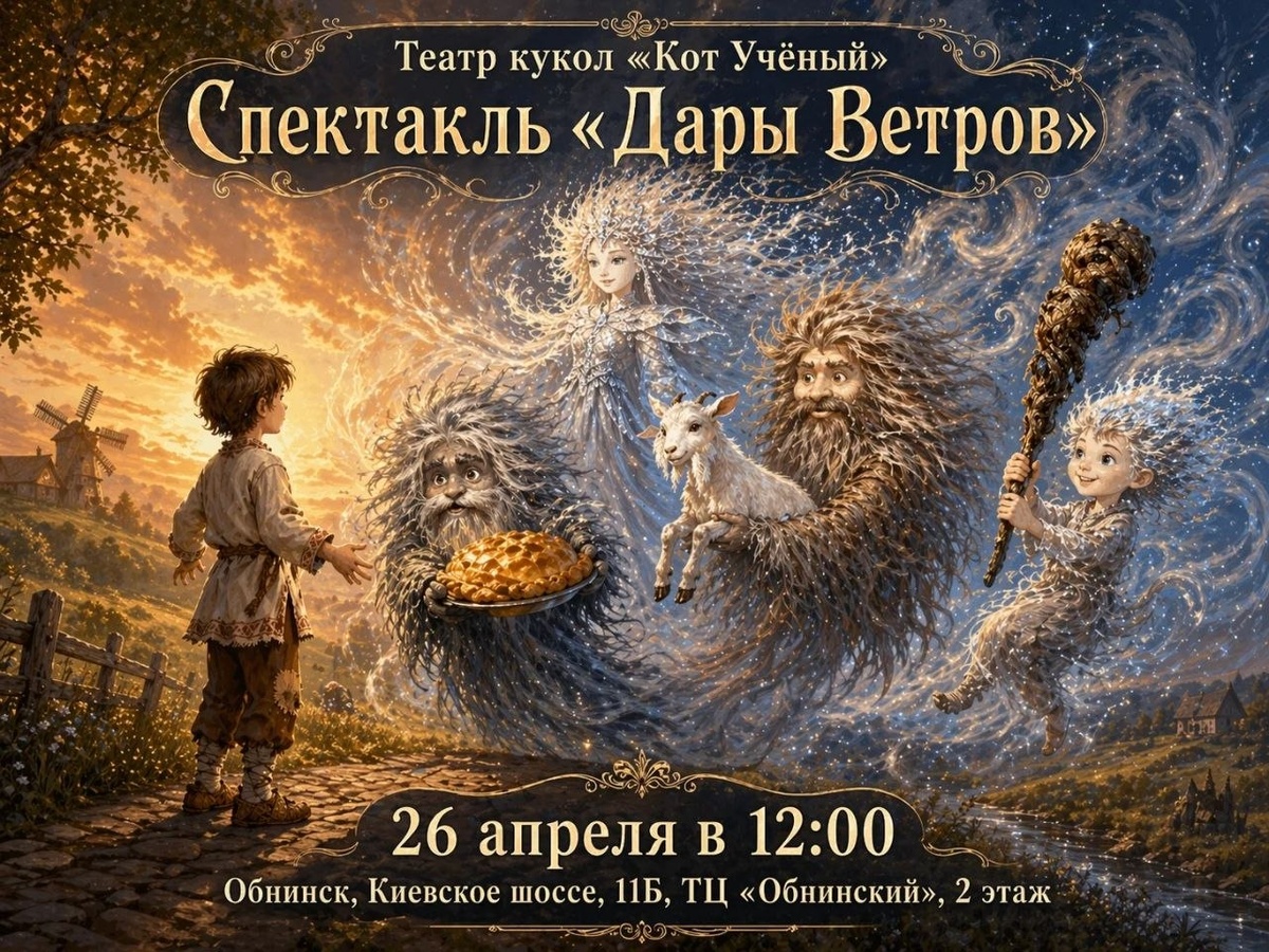 Театр кукол «Кот Учёный» в Обнинске приглашает на новый спектакль «Дары Ветров» (5+) 26 апреля в 12:00