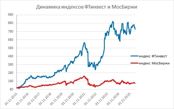 МосБиржи поднялся на 0,03% до 2733 пунктов, таким образом альфа нашего портфеля с 1 ноября 2015 составляет 649,51%, а с 1 января 2026 (-3,09% (индекс ФТинвест) – -1,12% (индекс МосБиржи)) = –1,97%.