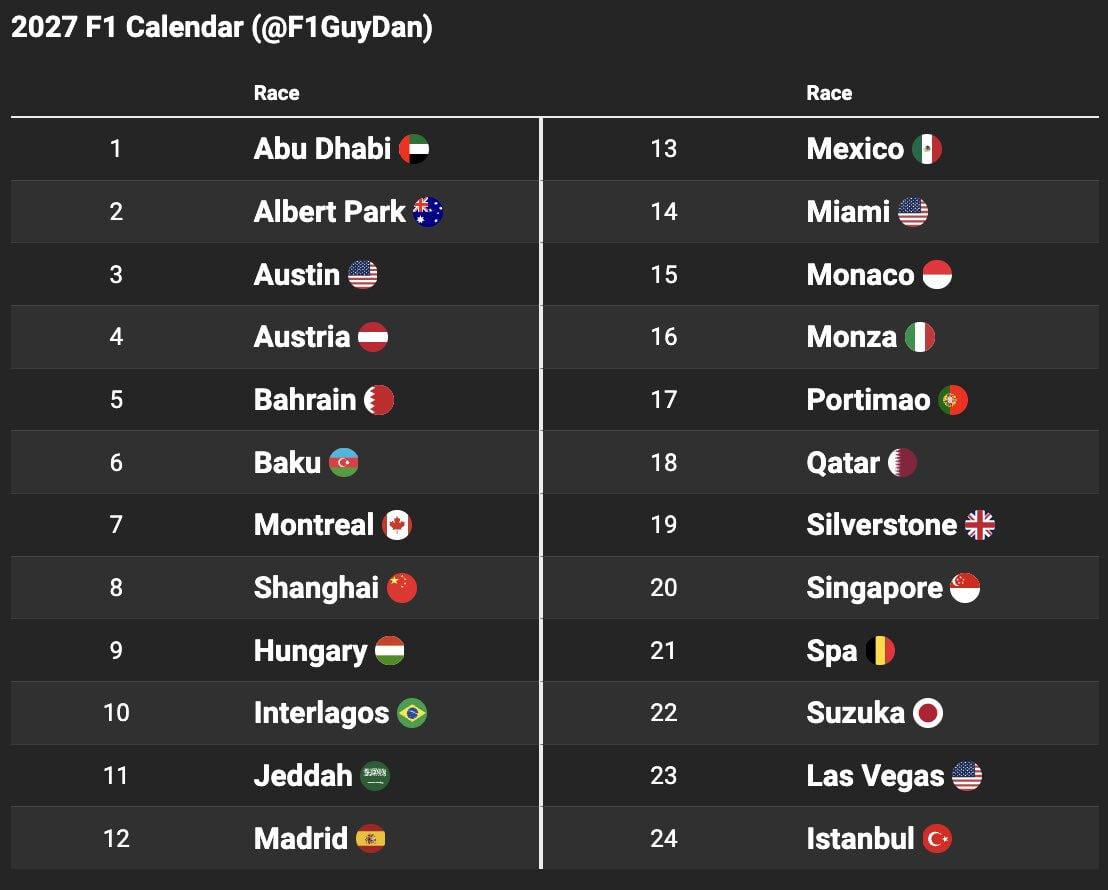 Пока на сезон 2027 года известно о 24 трассах, но не стоит исключать появления 25-й