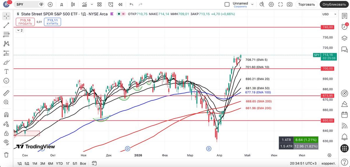 Продолжаем видеть ГЭПы ускорения даже на таких уровнях = это только говорит о сильном «бычьем» рынке. Но также может сигнализировать о возврате к быстрым скользящим — а как к ним подойдем? Покажет время: либо сильный пулбэк, либо консолидация. Крипта выглядят слабее фондового рынка, но также потихоньку ползет вверх. Но, возможно, вскоре, после паузы на фондовом рынке, увидим силу на крипторынке. А пока выжимаем всё что можно на фонде — это намного приятнее и выгоднее. Всем отличных выходных 😎 #spy #технический_анализ #америка #трейдинг_сша #фондовый_рынок #обзор #вывод #qqq #vix #smh #mags #xlk #ixic #крипта #btc