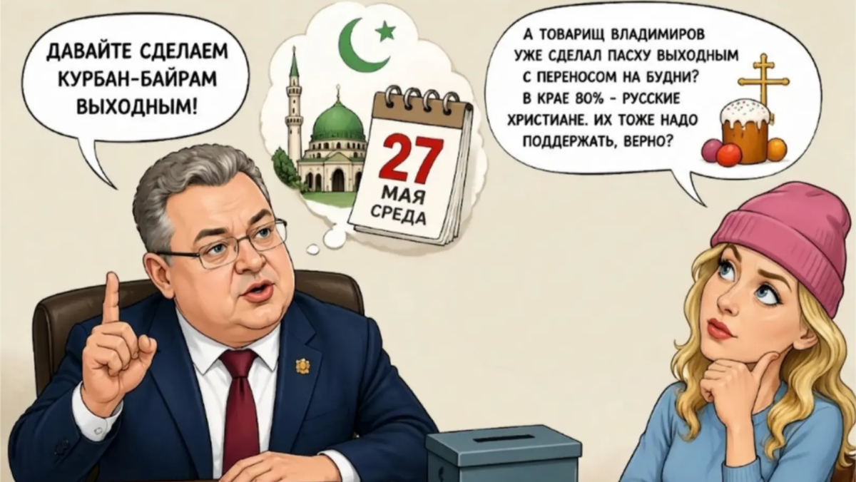 Губернатор Ставропольского края товарищ Владимиров выдал ошеломительную своей сногсшибательной свежестью и одновременно такой же абсурдностью инициативу. Цитирую: «Мы прекрасно понимаем, что Ставропольский край многонациональный. У нас очень много мусульман проживает на территории Ставропольского края, поэтому Игорь Олегович, надо голосование запустить. Всё-таки есть предложение в Ставропольском крае Курбан-байрам сделать выходным днём. В этом году это будет 27 мая, среда, поэтому давайте посмотрим настроения. Потому что, давайте честно скажем, что мы не мононациональные. Поэтому надо поддержать все конфессии». Вопрос от блондинки: А таварисч Владимиров уже сделал Пасху выходным днём (с переносом на будни), так как 80% проживающих в Ставропольском крае – это русские христиане, которых, получается, тоже надо поддержать? А ещё вопрос: А, что, к выборам надо прям сильно страну всякими такими странными инициативами раскачать? Чтобы гарантированно в хлам?