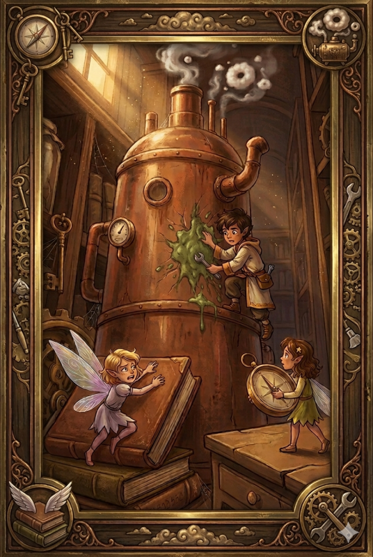 Длинные ряды стеллажей уходили в полумрак, теряясь в глубине. Тени от нагроможденных друг на друга сломанных механизмов: погнутых медных труб, треснувших линз и зазубренных шестеренок напоминали очертания спящих чудовищ. Задание оказалось на редкость нудным: на каждый предмет нужно наклеить этикетку с названием, найти подходящее место на стеллаже и записать номер ячейки в каталог.