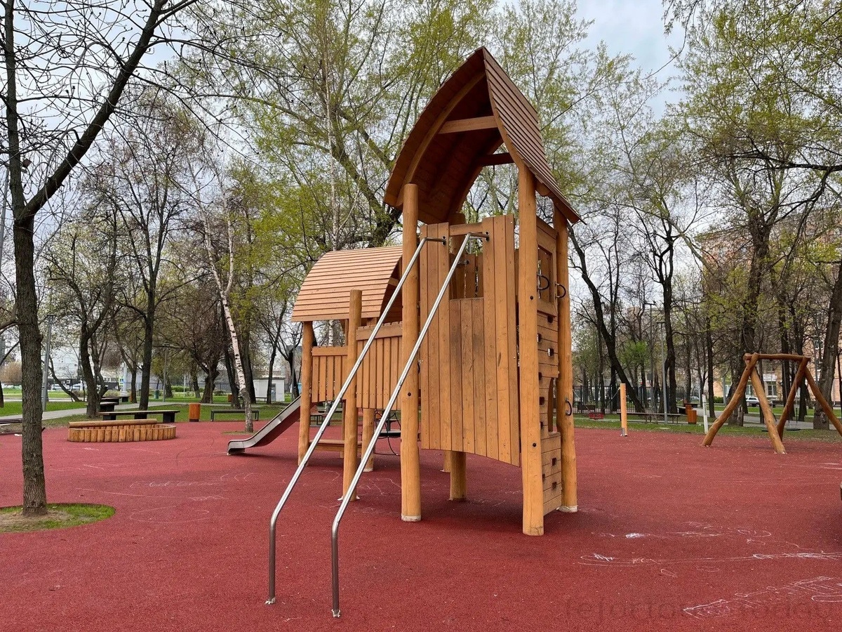 После благоустройства парка в нём появилась прекрасная детская площадка с домиком-горкой и блестящими перилами.