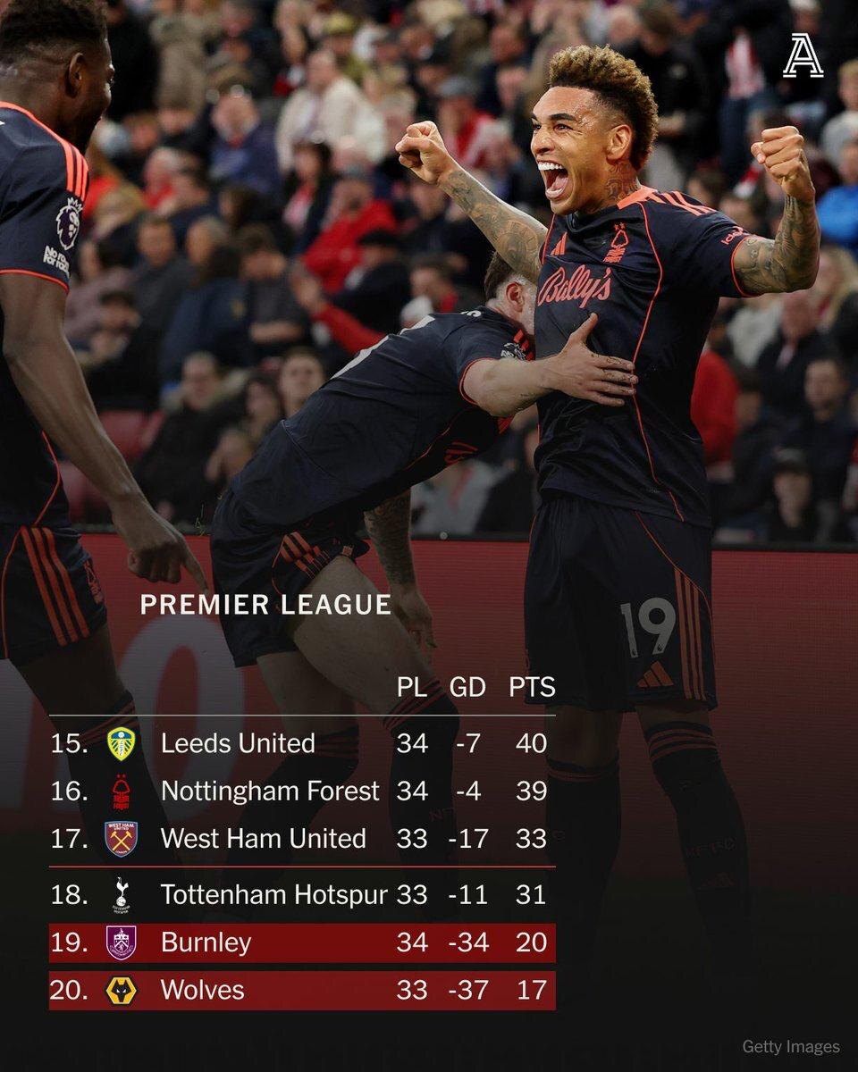 Ситуация в подвале таблицы Премьер-Лиги после победы "Ноттингем Форест" над "Сандерлендом" со счетом 0:5 ☝️
