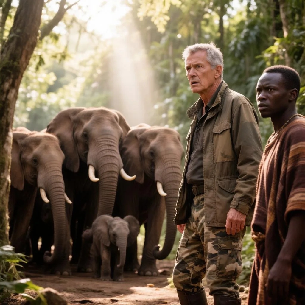 Проводник внезапно вскрикнул, предупреждая о приближении опасности. Однако было поздно. Слоны почувствовали угрозу своему потомству и мгновенно перешли в наступление. Испуганный слонёнок жалобно трубил, взрослые особи поднялись на задние ноги, громко хлопая ушами и издавая грозные звуки. Их массивные тела стремительно направились прямо на охотников.