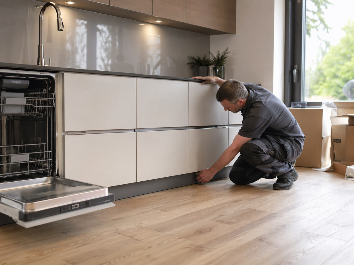 Встраиваемая посудомойка вроде бы подходит по ширине, стоит в нише, фасад навешен — но при открывании дверь упирается в цоколь.