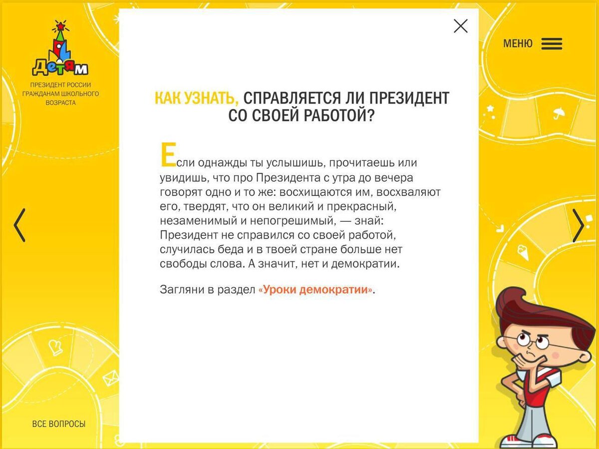 📚 Кстати, если книгу «Вредные советы» Григория Остера снимут с продаж, а его самого объявят экстремистом-террористом, то АП надо будет сделать вид, что Остер с властью не сотрудничал и не был автором текстов проекта kids.kremlin.ru – официального детского раздела сайта президента РФ, где в игровой форме рассказывается о демократии, государственном устройстве и истории Кремля. И по-тихому всё удалить задним числом, как будто не было таких текстов. А то мало того, что детишки узнают, что царь-то у нас узурпатор, так ещё и прочтут об этом от запрещённого автора на сайте Кремля!