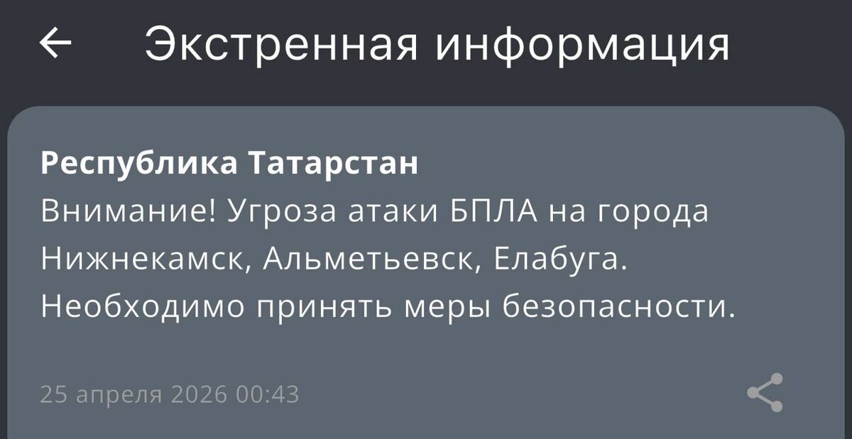 МЧС объявило об угрозе атаки БПЛА на города Нижнекамск, Альметьевск и Елабуга.