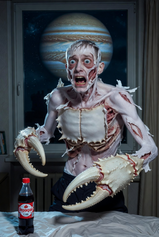 Простые мысли, навроде дозвониться до врачей, понять, что происходит, вернуть себе прежний облик, засудить производителей чудовищной отравы, сдавались под напором даже не мыслей – инстинктов древнего хищника. Искать добычу. Голодно. Убивать. Спариваться. С последним импульсом в голове вместо привлекательных девушек рождались образы гигантских уродливых бледных крабов, снующих по толстому льду под чёрным небом, на котором исполинским полосатым шаром висел безмолвный Юпитер. Вскоре ничего человеческого в мыслях Шмякина не осталось – сплошная инстинктивная тяга к виду, не существующему на Земле. Крупное бледное существо, похожее на краба, шлёпнулось на пол. Оно уже не напоминало человека абсолютно ничем – разве что было не настолько крупным, как те твари из видения. Скорее, экс-Шмякин размером приближался к кошке…