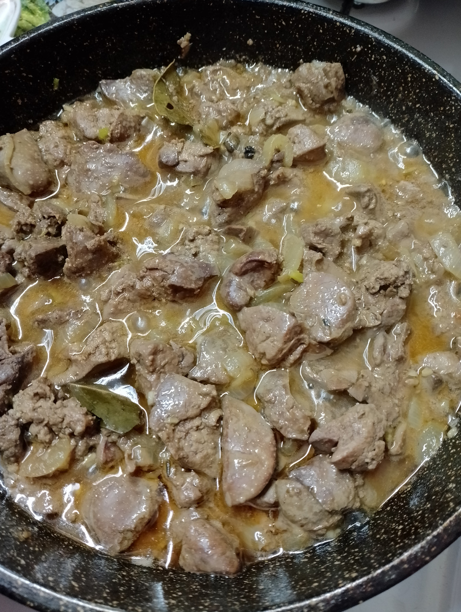 Печень куриная лоток 500 гр. Промыть порезать. Нарезать лук полукольцами. В сковороду налить масло растительное чтоб закрыло дно и выложить все сразу посолить закрыть крышкой и тушить на медленном огне мин15. Добавить специи, ложку томатной пасты, и тушить ещё мин 15.