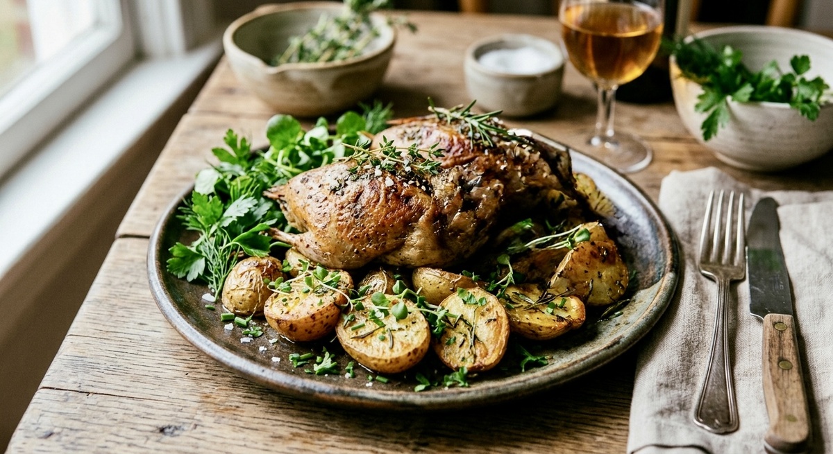 6. Подача: На тарелку выложите картофель, сверху положите вальдшнепа и посыпьте свежей зеленью. Можно добавить немного лимонного сока для яркости вкуса.
