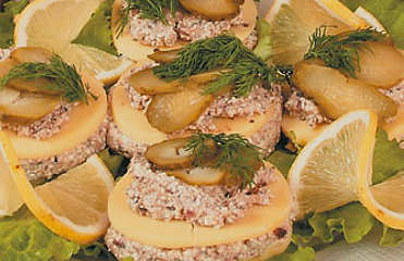 Ингредиенты: - 300 г сыра - 1 пачка творога - 1 банка шпрот - 2 ст. л. сливочного масла - маринованные грибы или огурцы Приготовление: Нарезать сыр ломтиками толщиной 0,5 см, из них рюмкой выдавить кружочки. Шпроты размять в масле и растереть с творогом и сливочным маслом. Подготовленную массу положить между двумя кружками сыра, ею же намазать верхний слой сыра. Украсить грибами или кружочками огурца.