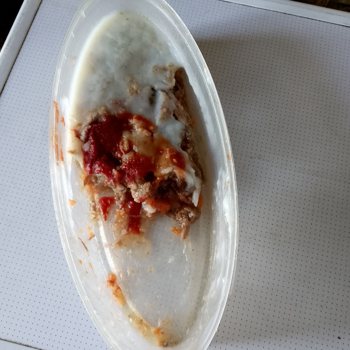 Видали? Такую картину холодца застала утром. Когда он успел? Понятное дело, ночью. Не, не голодный, но ночью любит и борщ поесть, а холодца давно не было, наверное, захотелось. Надо сказать, я холодец никогда не ем с кетчупом.