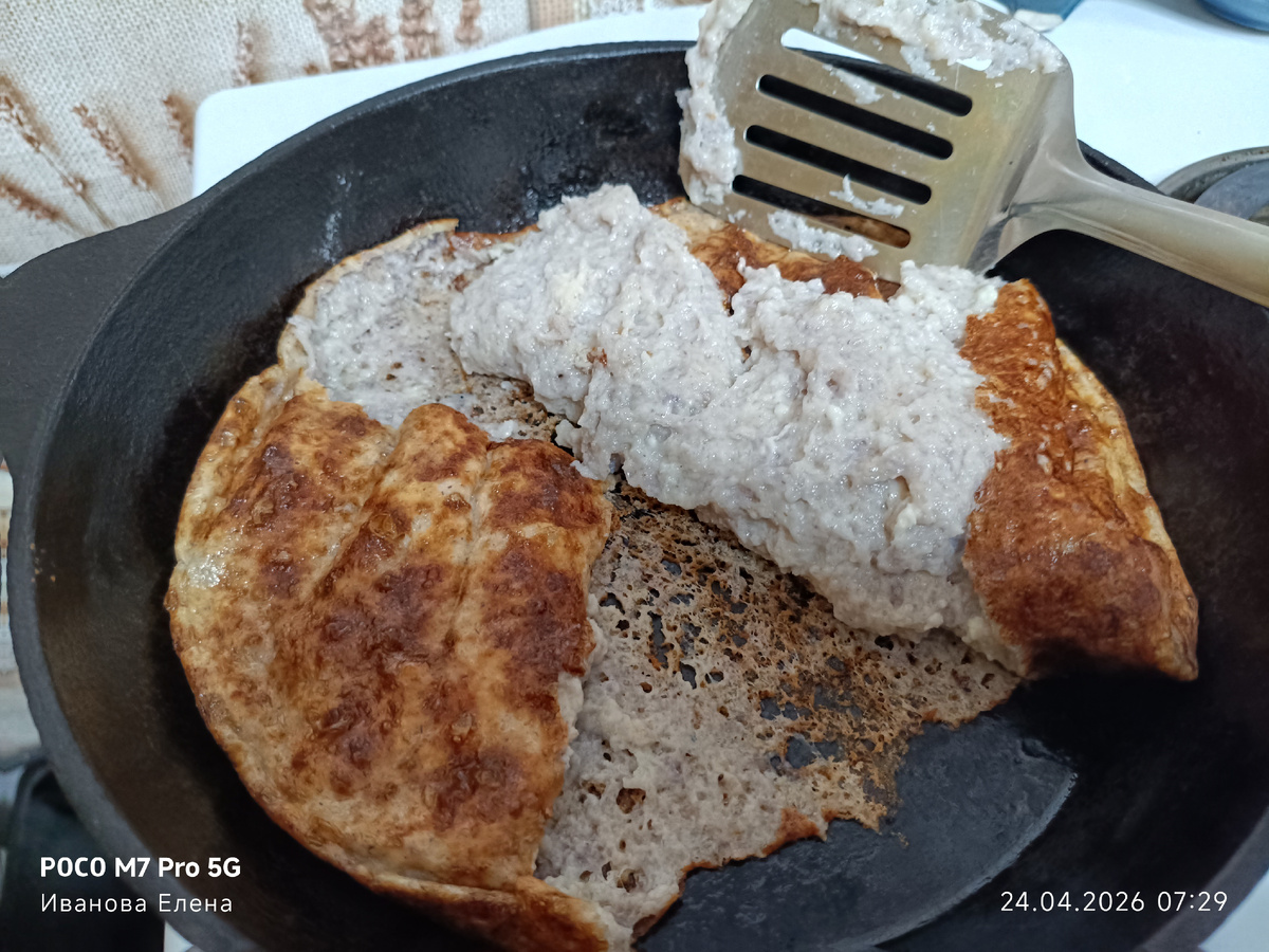 По мере дальнейшего выпекания каравай начал опадать. Сначала чуть-чуть, а потом — резко и бесповоротно. К моменту окончания выпечки в сковороде лежала расплывшаяся субстанция, отдалённо напоминающая хлеб. Еще и прилипла к сковороде, к которой в жизни никогда и ничего не прилипало.