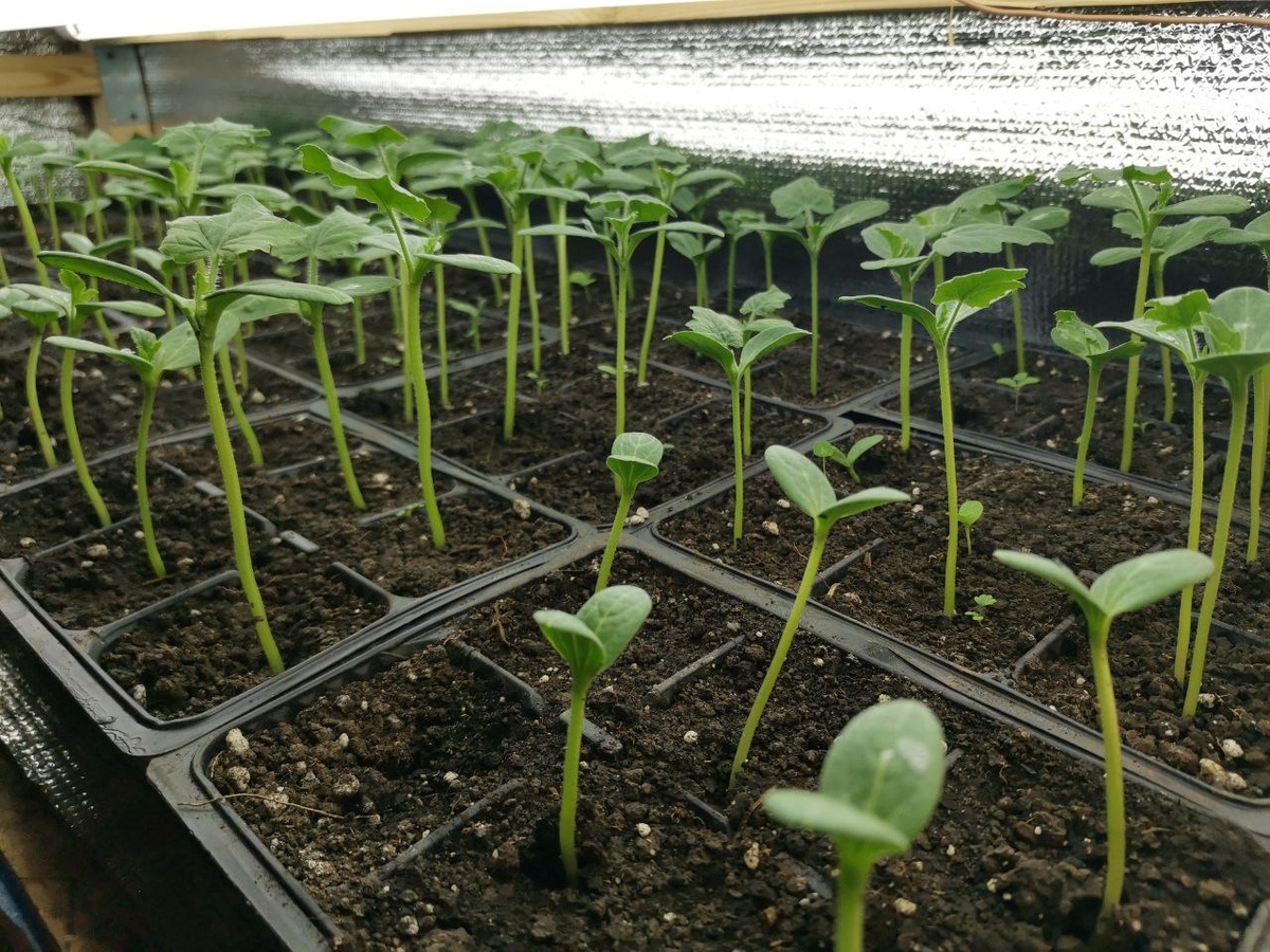 Я уже посеяла огурцы, арбузы, кабачки и дыни 17 апреля, на 5 сутки все они благополучно взошли. Всходы сейчас стоят на стеллаже под лампой и всё равно вытягиваются, лампа не мощная. Меня это не пугает и не волнует, но мне сегодня весь день приходят вопросы на эту тему.