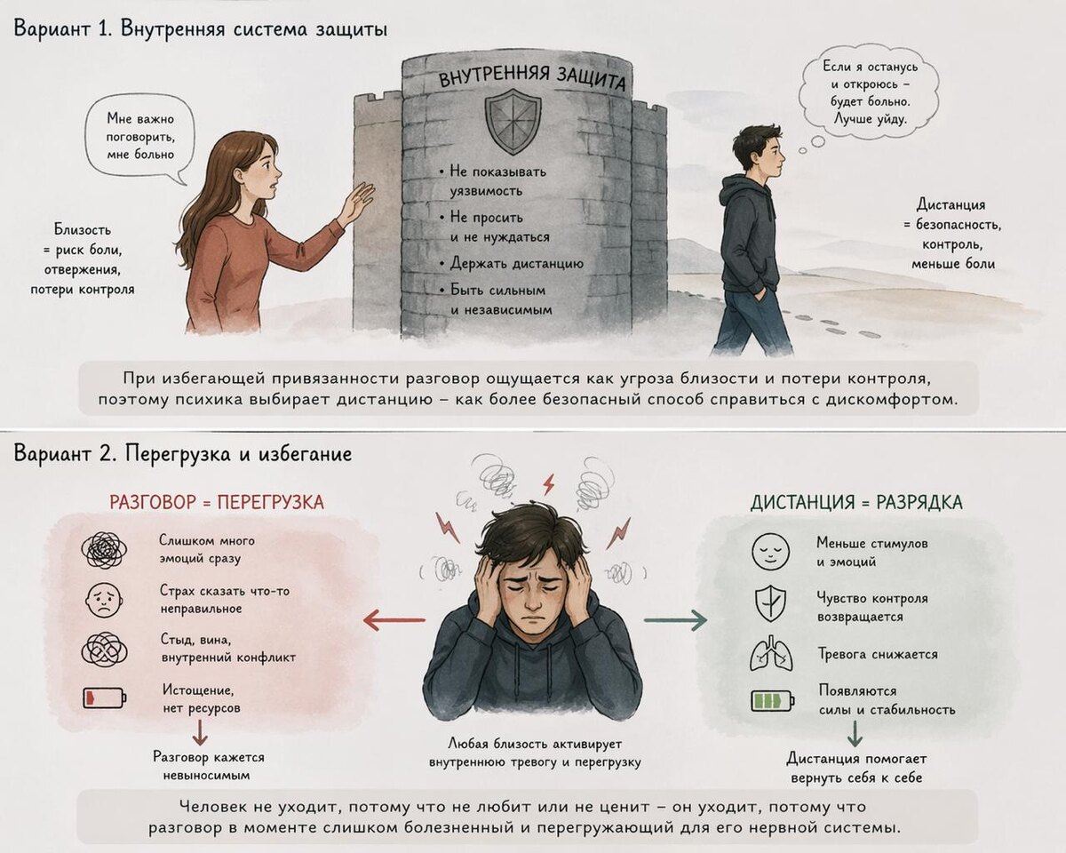 «Я хочу поговорить, а он уходит в другую комнату», «Она не обсуждает проблемы, а просто молчит несколько дней», «Когда я пытаюсь выяснить отношения, он надевает наушники». Я часто слышу это от партнёров людей с избегающей привязанностью. Почему вместо разговора они выбирают дистанцию? Короткий ответ: разговор для них опаснее, чем молчание. Почему дистанция, а не диалог? 1. Разговор = конфликт = угроза потери себя. В детстве у избегающего человека любые попытки говорить о чувствах или проблемах заканчивались либо наказанием, либо обесцениванием, либо контролем. Мозг запомнил: «Если я начну говорить - меня сломают, затянут, я исчезну». 2. Эмоциональная регуляция через уход. Когда избегающий чувствует давление (ваши слёзы, вопросы, требования), его нервная система перегружается. Единственный способ снизить напряжение - уйти в дистанцию. Это не злость, это физиологическая защита. 3. Страх сделать хуже. Избегающий часто думает: «Если я начну говорить, скажу что-то не то, обижу её, всё