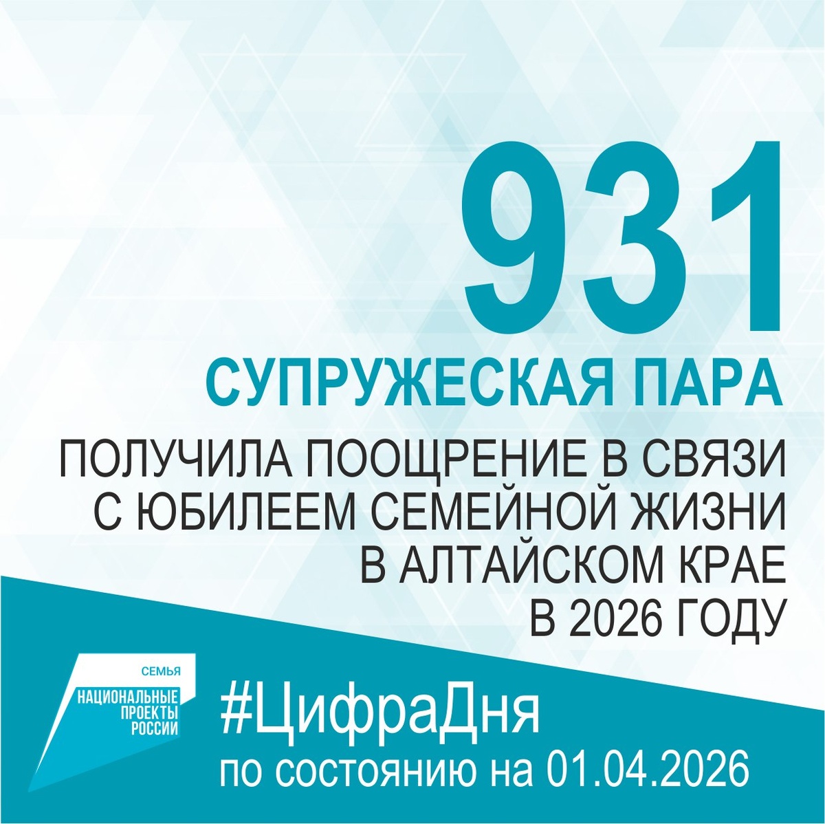 В Алтайском крае в 1 квартале 2026 года единовременное денежное поощрение супругам, отметившим 50-летие совместной жизни, получила 931