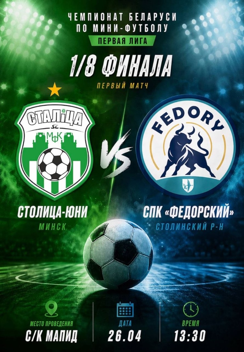 Первая лига. ▶️ 1/8 финала (первый матч) ⚽️ Столица-Юни (Минск) - СПК "Федорский" (Столинский р-н) 📅 26 апреля 2026 г. (Воскресенье) ⏰ Начало в 13:30 🏟️ с/к МАПИД, г. Минск