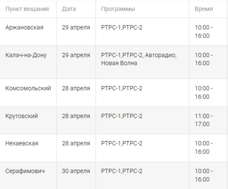 Волгоградское отделение РТРС предупреждает о возможных перерывах в трансляции телерадиосигнала в период с 27 апреля по 3 мая. Временные ограничения связаны с плановыми работами на радиотелевизионных передающих станциях и затронут шесть населённых пунктов региона. Все отключения согласованы с компаниями-вещателями. При этом специалисты отмечают, что некоторые работы могут быть отменены или перенесены из-за неблагоприятных погодных условий. График отключений по населённым пунктам: