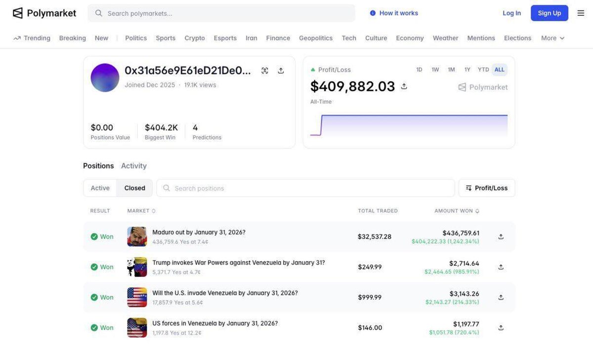 свержении Мадуро. По данным суда в Нью-Йорке, сержант спецназа Гэннон Ван Дайк делал ставки на платформе Polymarket, имея доступ к закрытой информации по операции в Венесуэле. За несколько дней до событий он поставил $34 тысяч на исход, который считался маловероятным и после этого поднял больше $400 тысяч. Прибыль составила 1242%. Деньги пытался прогнать через крипту и брокерские счета, но его вычислили. Теперь ему вменяют мошенничество и использование секретных данных. Просчитался, но где?
