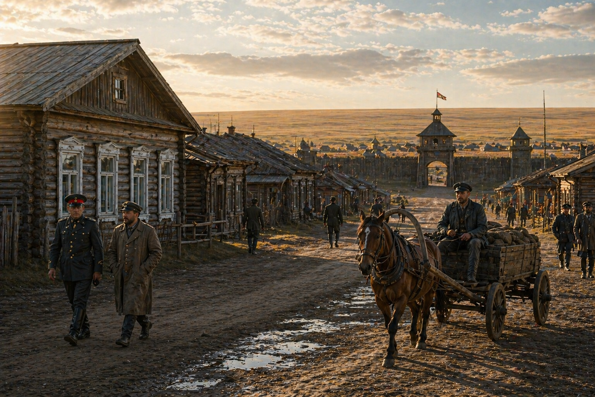 Есть города, где всё понятно с первого шага: улицы ведут, центр тянет, движение подталкивает вперёд. Акмолинск XIX века таким не был. Он не встречает, не объясняет, не показывает форму сразу. Перед глазами — степь, ветер, редкие дома, и ощущение, будто ты оказался в месте, где ещё ничего не решено. Сначала это сбивает. Кажется, что здесь нечего «считывать», не за что зацепиться взглядом. Но проходит немного времени — и происходит сдвиг. Пустота перестаёт быть пустотой, она начинает работать. В ней появляются линии, ритм, логика. Улицы уже не просто направления, дома — не просто постройки, люди — не просто фигуры. Всё начинает складываться в город, но не резко, а постепенно. И в какой-то момент ловишь себя на мысли: ты наблюдаешь не место, а процесс. Акмолинск не показывает себя — он происходит прямо у тебя на глазах. В Акмолинске сразу чувствуется масштаб. Дома есть, но они не задают город. Главным становится расстояние между ними, воздух, который не зажат стенами. Это не пустота, а п