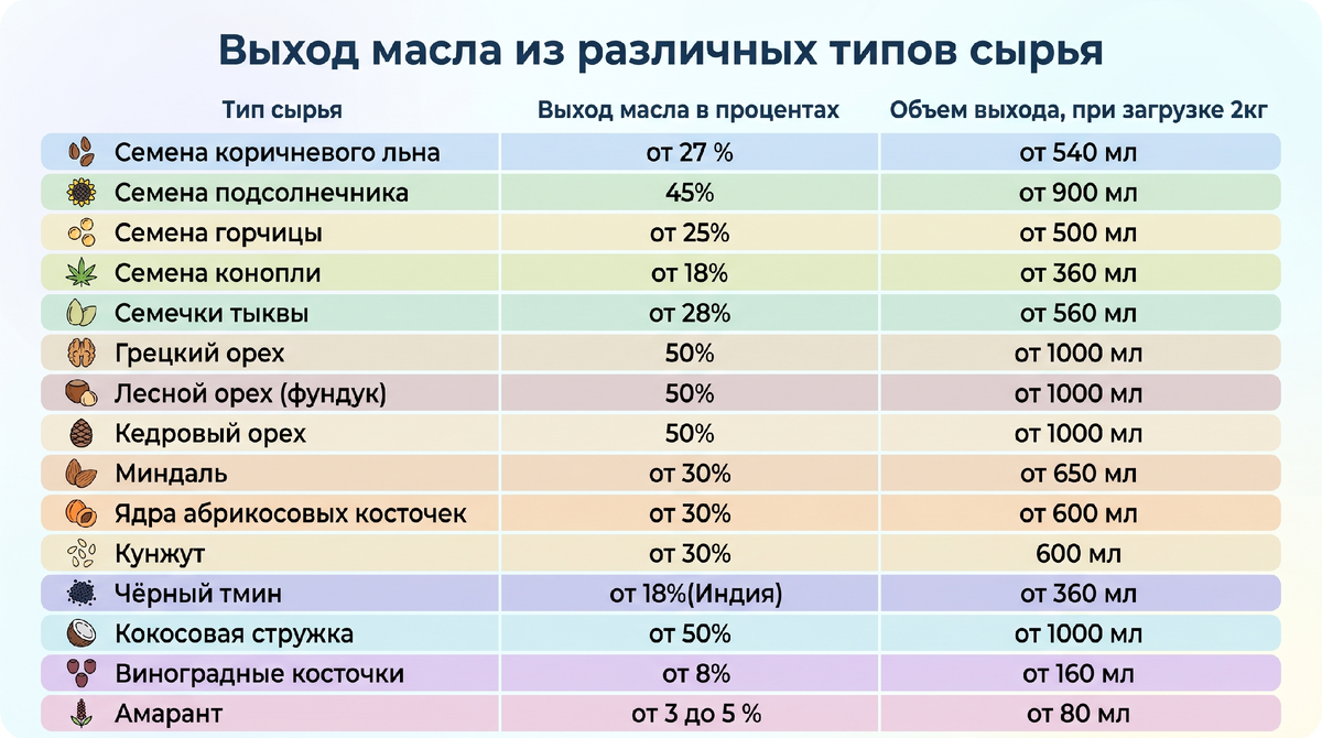 Какой выход масла на маслопрессе 50 тонн из разного сырья?