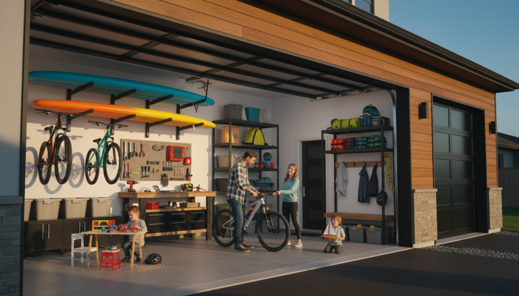 Это продуманное пространство с несколькими сценариями: хранение транспорта и снаряжения, мастерская, зона обслуживания дома (инструменты, садовая техника), иногда даже мини‑спортзона. И всё это — без ощущения склада, где вещи давят морально и физически.